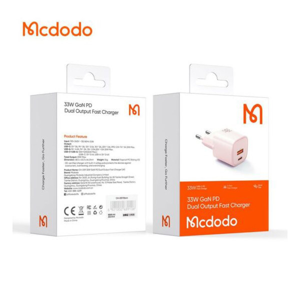 شارژر دیواری 33 وات مک دودو مدل GaN PD دارای 2 پورت یا درگاه بوده که، یک درگاه آن Type C و یک درگاه آن یو اس بی (USB) می باشد.این پورت تایپ سی از تکنولوژی فست شارژ PD اپل و سامسونگ پشتیبانی میکند.این شارژر از جنس Fireproof PC (ضدحریق و نسوز) با تکنولوژی روز ساخته شده است.این محصول از فناوری GaN (GaN در واقع خلاصه شدهی Gallium Nitride یا گالیوم نیترید است که یکی از مواد نیمه رسانای جدید محسوب میشود. از جمله ویژگیهای این ماده میتوان به پهنای باند بالا، رسانایی گرمایی زیاد، مقاومت گرمایی زیاد، مقاوم تابشی، مقاومت در برابر اسید و قدرت و استحکام بالا اشاره کرد) بهره مند است که از به روزترین فناوری های شارژ سریع برای هر دو پورت پشتیبانی میکند.میزان توان خروجی هر پورت در تصاویر امده است.این شارژر دیواری از سری Nano محصولات مک دودو می باشد که بر اساس رنگبندی با کدهای CH-0151,CH-0152,CH-0154,CH-0155,CH-0156 تفکیک می شوند.شارژر Mcdodo محافظت 9 لایه ای ارائه می دهد تا با خیال آسوده از آن استفاده کنید.این آداپتور در برابر توان، دما، ولتاژ،جریان و شارژ بیش از اندازه از گوشی شما محافظت می کند. همچنین جلوی اتصال کوتاه را می گیرد و جرقه نمی زند.