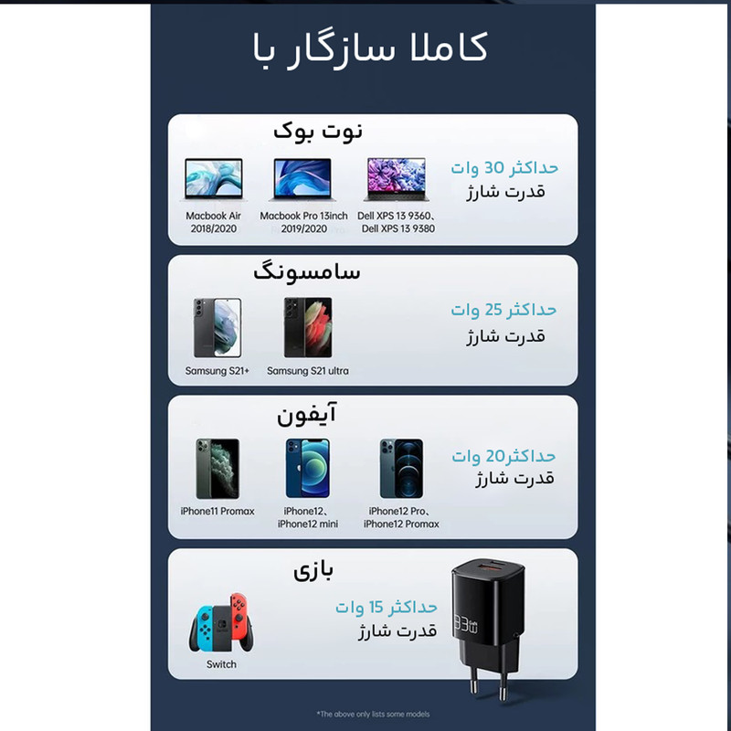 شارژر دیواری 33 وات مک دودو مدل GaN PD دارای 2 پورت یا درگاه بوده که، یک درگاه آن Type C و یک درگاه آن یو اس بی (USB) می باشد.این پورت تایپ سی از تکنولوژی فست شارژ PD اپل و سامسونگ پشتیبانی میکند.این شارژر از جنس Fireproof PC (ضدحریق و نسوز) با تکنولوژی روز ساخته شده است.این محصول از فناوری GaN (GaN در واقع خلاصه شدهی Gallium Nitride یا گالیوم نیترید است که یکی از مواد نیمه رسانای جدید محسوب میشود. از جمله ویژگیهای این ماده میتوان به پهنای باند بالا، رسانایی گرمایی زیاد، مقاومت گرمایی زیاد، مقاوم تابشی، مقاومت در برابر اسید و قدرت و استحکام بالا اشاره کرد) بهره مند است که از به روزترین فناوری های شارژ سریع برای هر دو پورت پشتیبانی میکند.میزان توان خروجی هر پورت در تصاویر امده است.این شارژر دیواری از سری Nano محصولات مک دودو می باشد که بر اساس رنگبندی با کدهای CH-0151,CH-0152,CH-0154,CH-0155,CH-0156 تفکیک می شوند.شارژر Mcdodo محافظت 9 لایه ای ارائه می دهد تا با خیال آسوده از آن استفاده کنید.این آداپتور در برابر توان، دما، ولتاژ،جریان و شارژ بیش از اندازه از گوشی شما محافظت می کند. همچنین جلوی اتصال کوتاه را می گیرد و جرقه نمی زند.