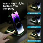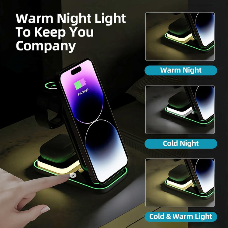 با شارژر رومیزی بی سیم مدل 4in1 Magnetic Wireless A8 با زحمت نگه داشتن مداوم تلفن خود در حین شارژ شدن خداحافظی کنید. این دستگاه مبتکرانه به عنوان یک نگهدارنده تلفن همراه ایمن عمل می کند. چه در حال تماشای ویدیو یا تماس ویدیویی با عزیزان خود باشید، این شارژر راحتی بیدردسر را تضمین میکند. این شارژر زیبا نه تنها 3 دستگاه شما را به صورت همزمان شارژ می کند، بلکه دارای یک چراغ LED شب فعال لمسی است. اکنون می توانید بدون زحمت تلفن ,ساعت و هندزفری خود را شارژ کنید و در عین حال از نور درخشنان و آرامش بخشی لذت ببرید که هر اتاقی را زیباتر می کند. این دستگاه 4در 1با طراحی مغناطیسی قوی خود، دستگاه شما را در طول فرآیند شارژ به طور ایمن متصل نگه میدارد. دیگر به قطع و وصل شدن تصادفی شارژر نیازی نیست, این ویژگی مغناطیسی هر بار اتصال قابل اعتماد را تضمین می کند. این شارژر قابلیت قرار دادن گوشی به صورت افقی و عمودی را داراست که در هر صورت راحتی شما را به دنبال خواهد داشت, فقط کافیست صفحه نگهدارنده برای گوشی را بالا و پایین ببرید تا به درجه دلخواه خود برسید. توان خروجی تلفن همراه: 15W, توان خروجی ایرپاد: 3W, توان خروجی ساعت: 2.5W توجه: این محصول برای تمامی دستگاه هایی که از Wireless پشتیبانی میکنند قابل استفاده می باشد. (استاندارد Qi)