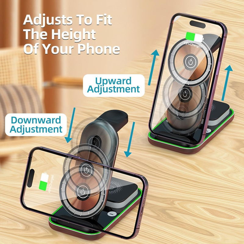 با شارژر رومیزی بی سیم مدل 4in1 Magnetic Wireless A8 با زحمت نگه داشتن مداوم تلفن خود در حین شارژ شدن خداحافظی کنید. این دستگاه مبتکرانه به عنوان یک نگهدارنده تلفن همراه ایمن عمل می کند. چه در حال تماشای ویدیو یا تماس ویدیویی با عزیزان خود باشید، این شارژر راحتی بیدردسر را تضمین میکند. این شارژر زیبا نه تنها 3 دستگاه شما را به صورت همزمان شارژ می کند، بلکه دارای یک چراغ LED شب فعال لمسی است. اکنون می توانید بدون زحمت تلفن ,ساعت و هندزفری خود را شارژ کنید و در عین حال از نور درخشنان و آرامش بخشی لذت ببرید که هر اتاقی را زیباتر می کند. این دستگاه 4در 1با طراحی مغناطیسی قوی خود، دستگاه شما را در طول فرآیند شارژ به طور ایمن متصل نگه میدارد. دیگر به قطع و وصل شدن تصادفی شارژر نیازی نیست, این ویژگی مغناطیسی هر بار اتصال قابل اعتماد را تضمین می کند. این شارژر قابلیت قرار دادن گوشی به صورت افقی و عمودی را داراست که در هر صورت راحتی شما را به دنبال خواهد داشت, فقط کافیست صفحه نگهدارنده برای گوشی را بالا و پایین ببرید تا به درجه دلخواه خود برسید. توان خروجی تلفن همراه: 15W, توان خروجی ایرپاد: 3W, توان خروجی ساعت: 2.5W توجه: این محصول برای تمامی دستگاه هایی که از Wireless پشتیبانی میکنند قابل استفاده می باشد. (استاندارد Qi)