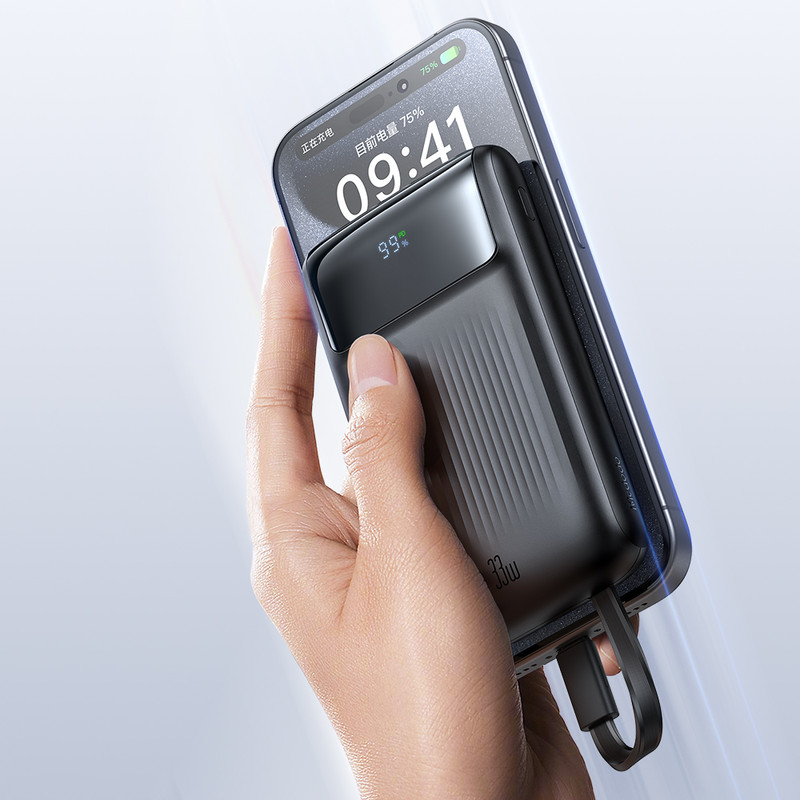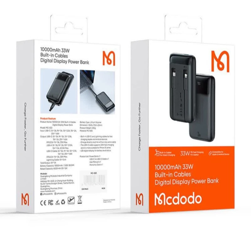 این پاور بانک دارای قابلیت شارژ سریع آیفون 14 و 15 و 16 می باشد. توان این پاوربانک 33 وات می باشد و دارای نمایشگر دیجیتالی باتری می باشد. از مزیت این پاوربانک متصل بودن دو کابل تایپ سی و لایتنینگ به خود پاوربانک جهت جلوگیری از حمل اقلام اضافه می باشد. این پاوربانک دارای خروجی USB و تایپ C نیز می باشد.