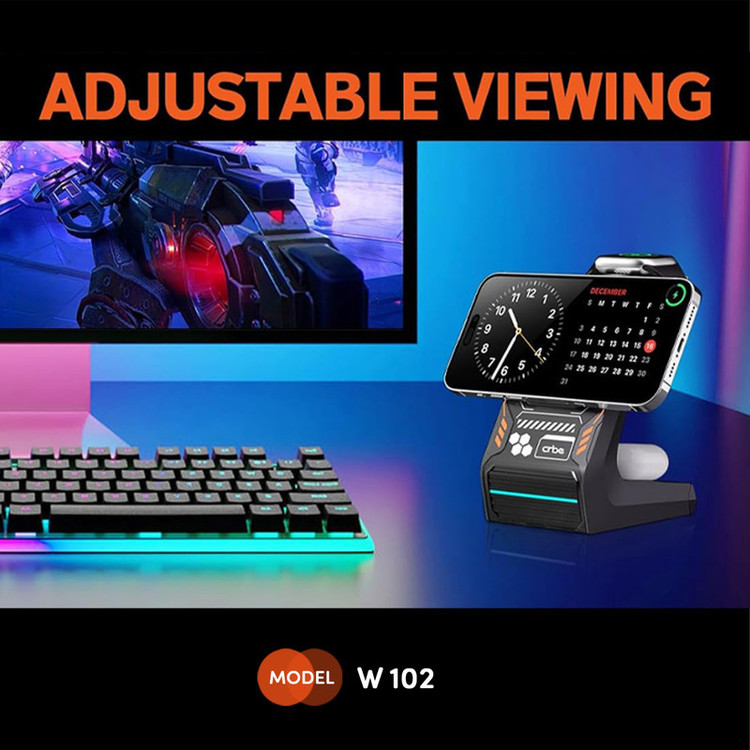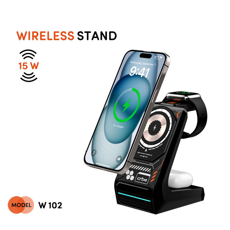 شارژر رومیزی وایرلس کربی مدل W102 3in1 یک شارژر همه کاره و کم نظیر از کمپانی کربی که میتوانید به صورت همزمان 3 دستگاه خود را به لطف قابلیت Quick Charging به صورت سریع شارژ کنید این 3 دستگاه شامل گوشی هوشمند ، ساعت هوشمند ، کیس ایرفون ( ایرپاد اپل ) میباشد . به طور کلی شارژر رومیزی کربی قابل استفاده برای شارژ تمام دستگاه های هوشمندی که از قابلیت شارژ بی سیم پشتیبانی میکنند، میباشد. یک پایه تلفن وجود دارد که در آن می توانید گوشی هوشمند خود را با حالت شارژ بی سیم شارژ کنید و در عین حال فیلم یا سریال مورد علاقه خود را مشاهده کنید.. جایگاه هدفون فقط برای Airpods نیست، همچنین می توانید مدل های بادز سامسونگ و TWS های دیگر خود را شارژ کنید.. تنها راه برای شارژ آخرین مدل های اپل واچ در حال حاضر استفاده از شارژر مغناطیسی است. جایگاه شارژ ساعت هوشمند این دستگاه برای کاربران اپل واچ و ساعت های هوشمند دیگر کاربرد دارد.این شارژر رومیزی دارای قسمت مخصوص قرار دادن کیس ایرفون شما برای داشتن شارژ بی سیم است. توجه داشته باشید که این ایستگاه شارژ می تواند AirPods شما را با فناوری شارژ بی سیم شارژ سریع کند. حتی شما می توانید از AirPods خود استفاده کنید و فقط کیس را برای شارژ قرار دهید.توان خروجی این شارژر بی سیم تا 15 وات بوده و برای گوشی های ایفون خروجی 7.5 وات در نظر گرفته شده است . بهترین نکته این ایستگاه شارژر این است که می توانید از تمام جایگاه ها و پورت آن به طور همزمان استفاده کنید. توان خروجی این شارژر برای شارژ ایرپاد تا 2.5 وات و برای ساعت های هوشمند تا 3 وات در نظر گرفته شده است .همچنین این شارژر رومیزی دارای یک ال ای دی زیبا میباشد که در نور کم به راحتی میتوانید آن را ببینید.