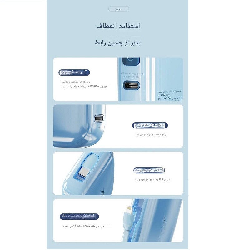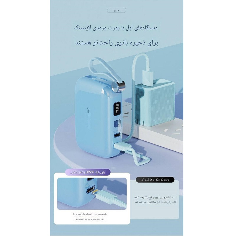 پاوربانک JP509 دارای نمایشگر دیجیتال برای نمایش میزان شارژ باقیمانده، باتری لیتیوم پلیمر با کیفیت، و چیپ نوسانگیر ولتاژ برای افزایش ایمنی در هنگام شارژ است.